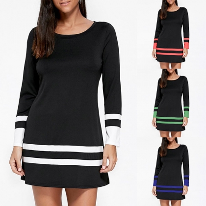 Fashion Striped Spliced Long Sleeve Round Neck T-shirt Dress