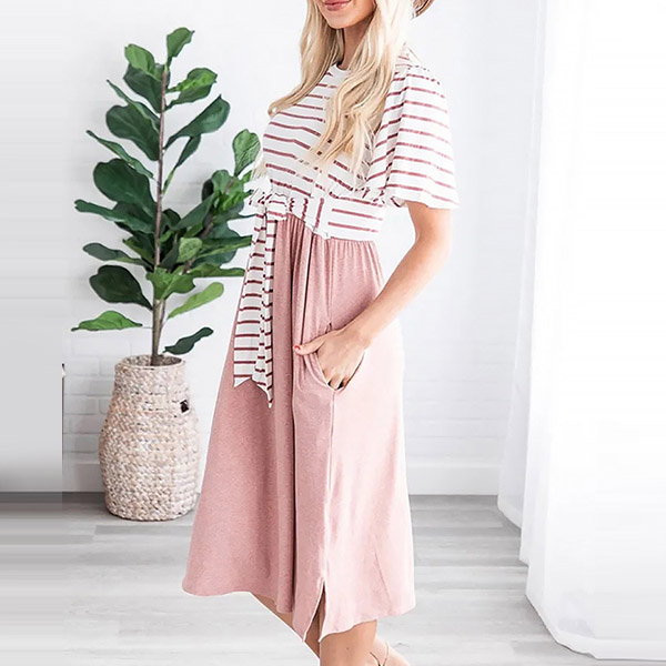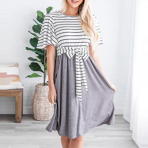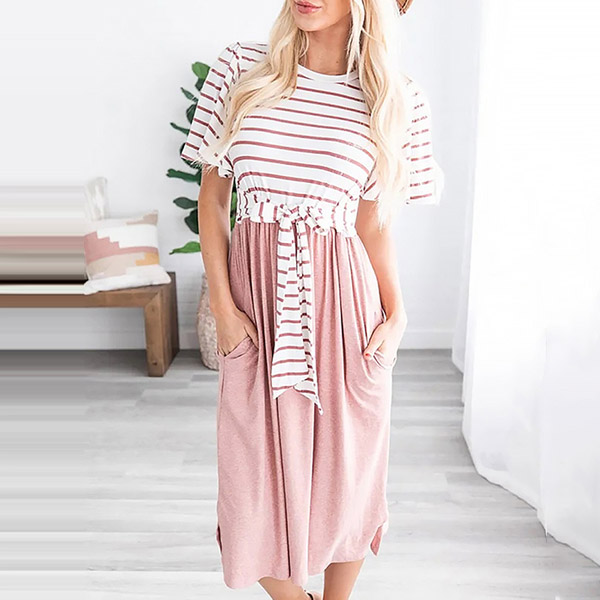 Fashion Striped Spliced Short Sleeve Round Neck Lace-up Dress