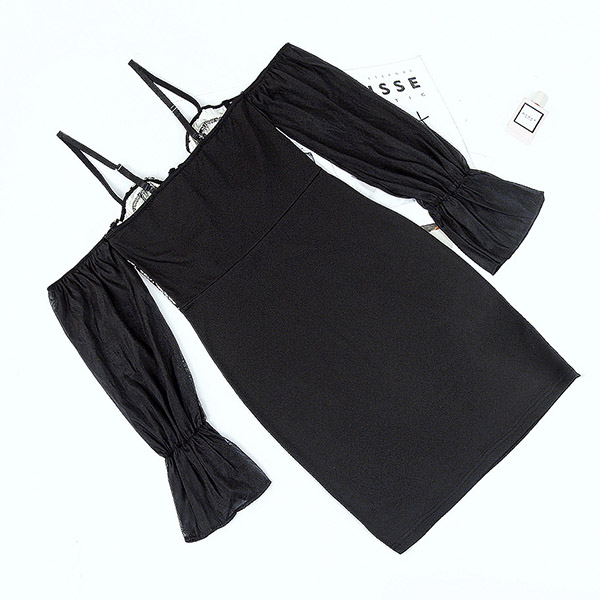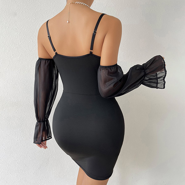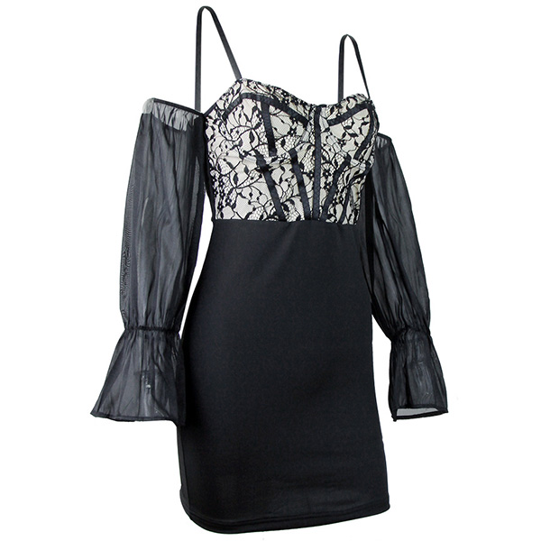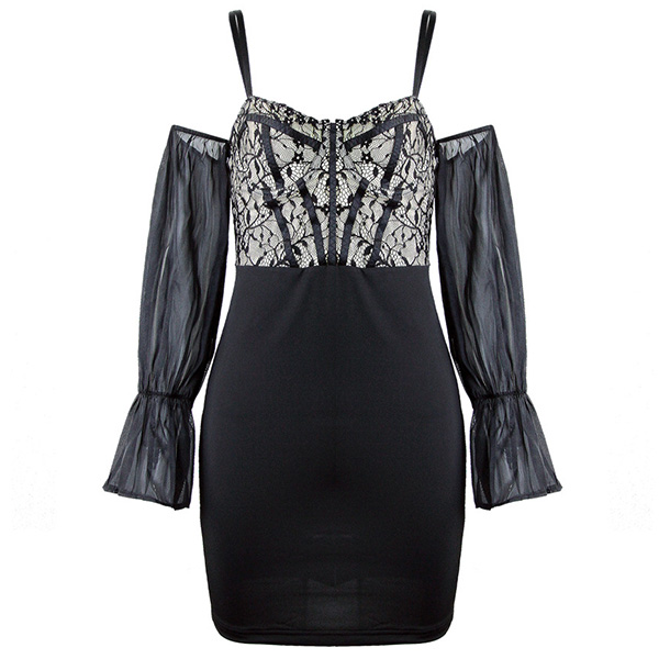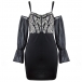 Fashion Sweetheart Neckline Lace Spliced Bodice Gauze Spliced Open-shoulder Trumpet Long Sleeve Slip Bodycon Dress