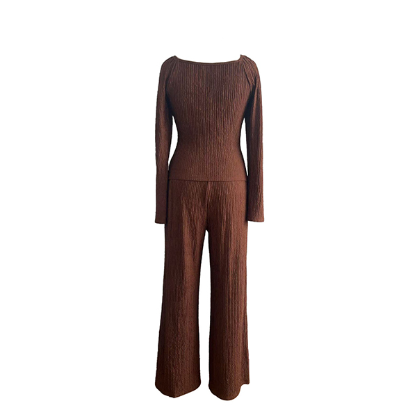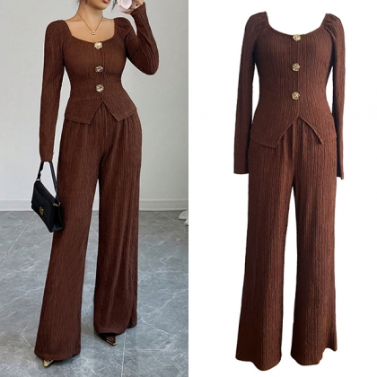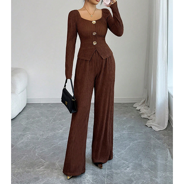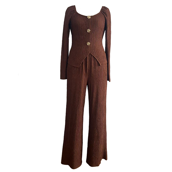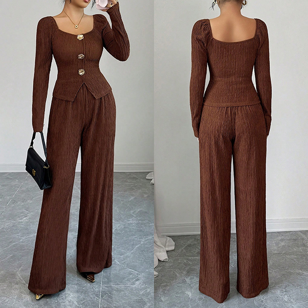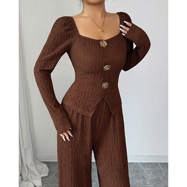 Trendigt tvådelat set i texturerat material – skjorta med rosformade knappar och raka byxor