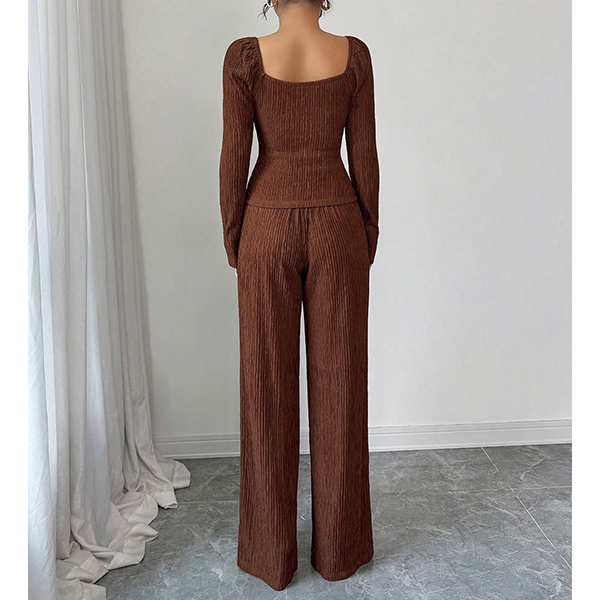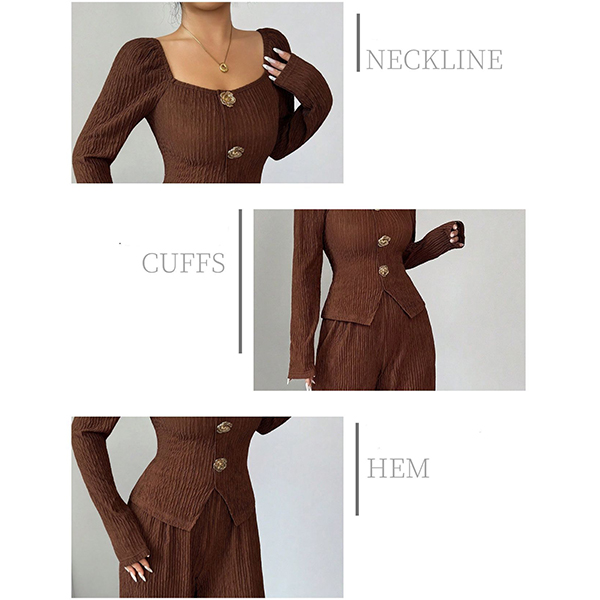 Detta tvådelade set består av en matchande skjorta med rosenformade knappar och eleganta, rakt skurna byxor som ger en modern, romantisk och skräddarsydd elegans. Rosenknapparna skapar delikata blommiga detaljer med feminin charm, medan det texturerade tyget tillför en dimensionell känsla och en taktil, lyxig sofistikering. Vill du prova?