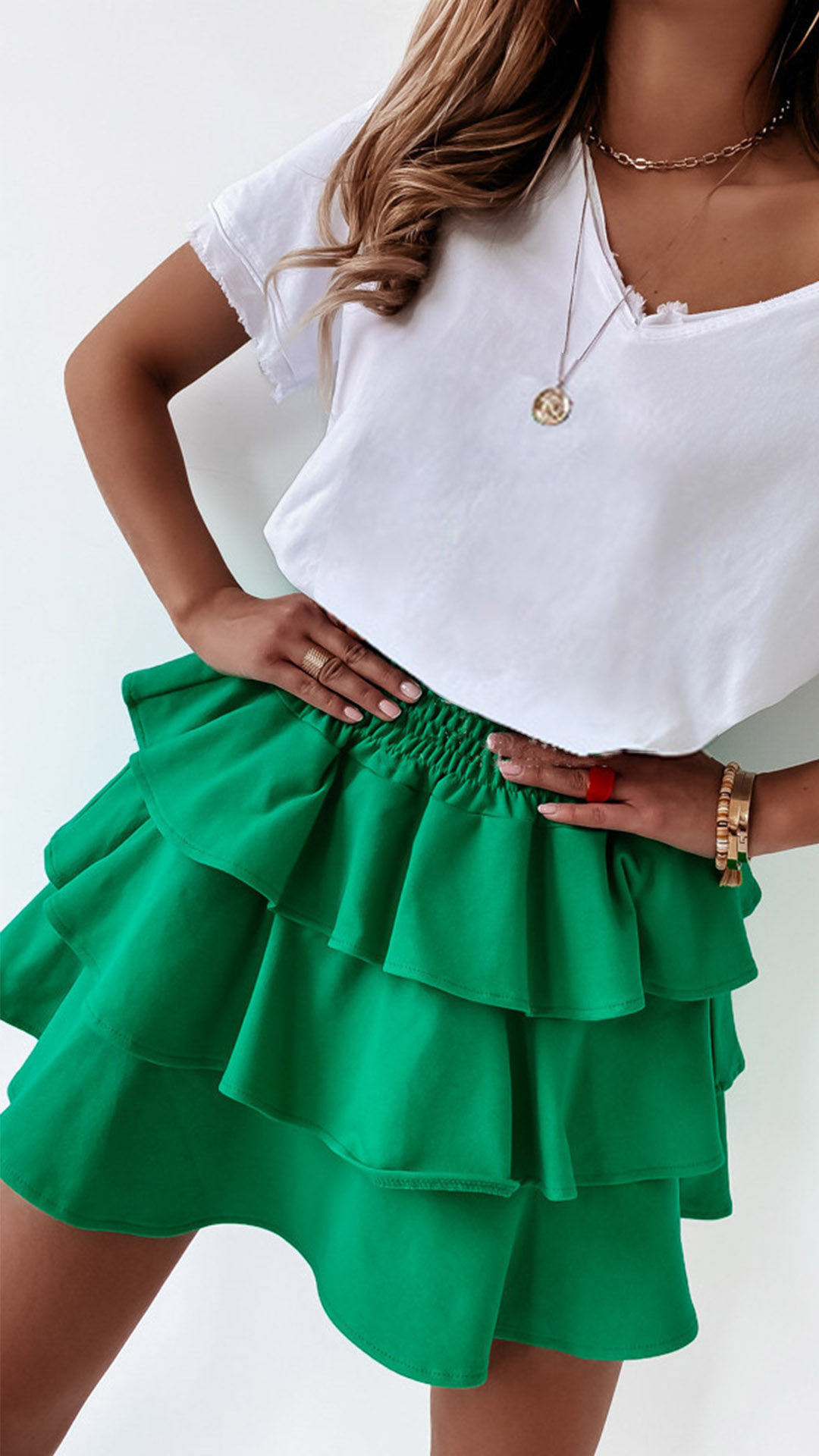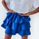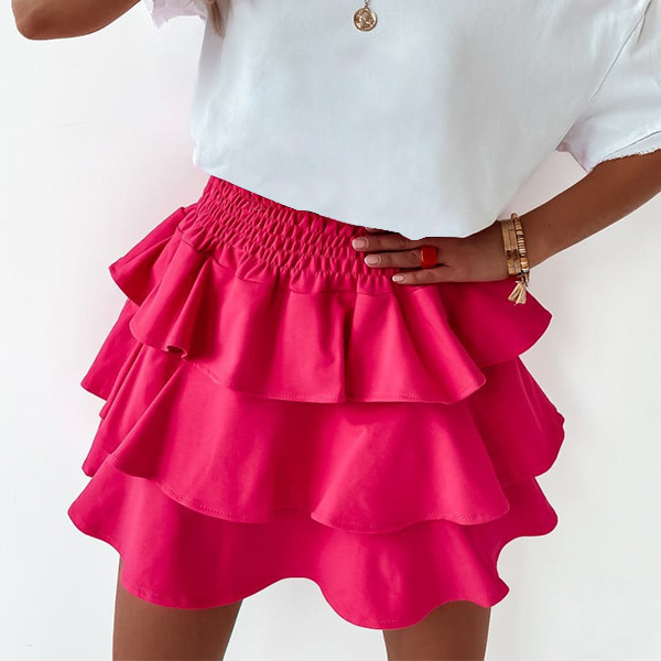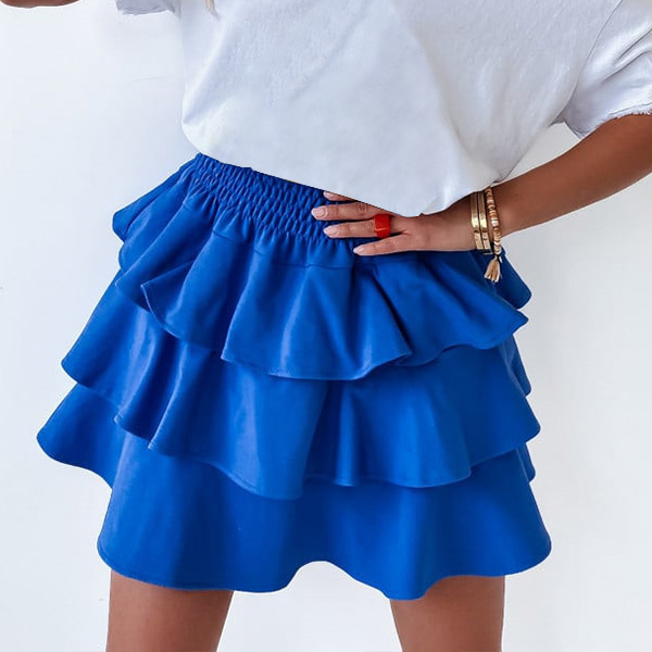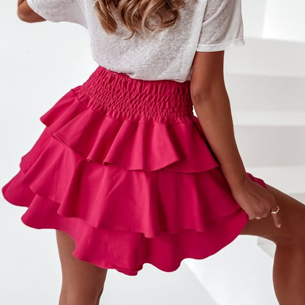 This fashionable mini skirt features a tiered design and an elastic waist, making it comfortable and easy to wear.
