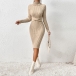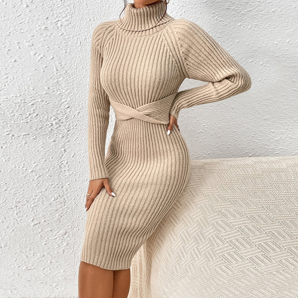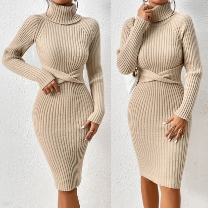 Denna stickade klänning har en elegant polotröja med korsmönster i midjan, bekväma långa ärmar och ribbade detaljer för en modern, mysig och sofistikerad stil. Perfekt för vardagliga tillfällen, mysig stil eller sofistikerad och bekväm matchning.