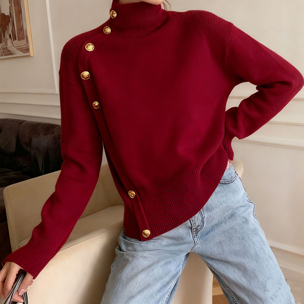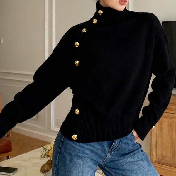 Denna tröja är en elegant polotröja med moderna knappdekorationer på sidan och en bekväm, stickad konstruktion som ger en stilren och samtida look. Kombinera med skräddarsydda byxor och moderna accessoarer för en sofistikerad framtoning.