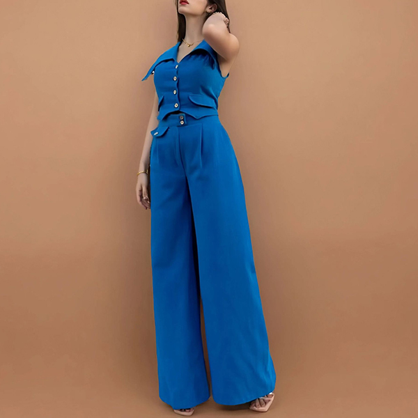 Detta tvådelade set kan bäras tillsammans för en elegant och sammanhängande look, eller stylas separat med andra plagg i din garderob för olika outfits. Det korta linnet har en modern och ungdomlig siluett, perfekt för att visa upp magen eller bäras över en åtsittande topp. De rakt skurna byxorna ger en elegant och skräddarsydd passform, vilket skapar en sofistikerad och vältränad outfit.