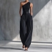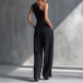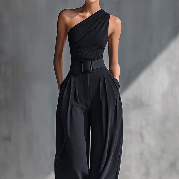 Modernt tvådelat set med asymmetrisk off-shoulder topp och vida byxor med bälte