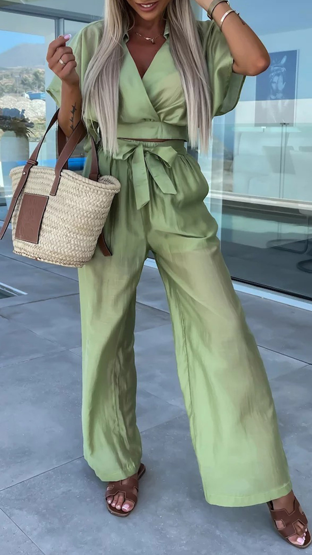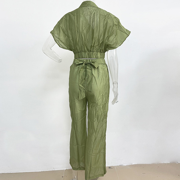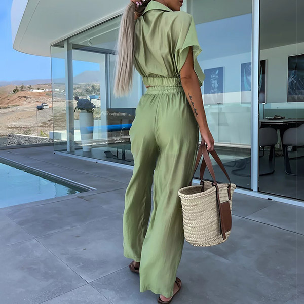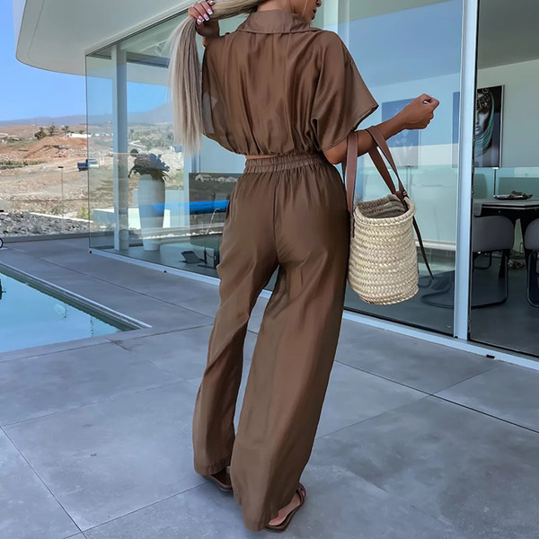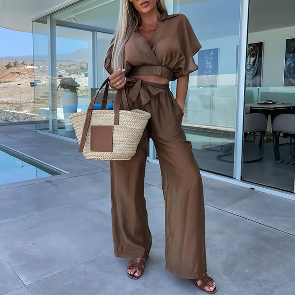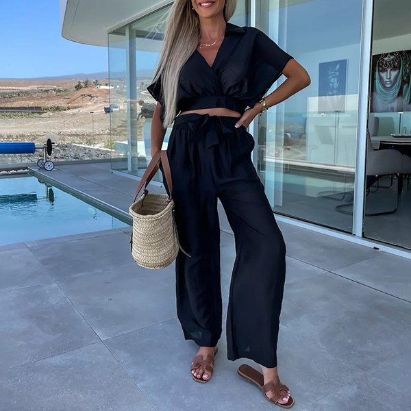 This stylish and comfortable two-piece set features a V-neck crop top and wide-leg pants that add a touch of personality to your look. The comfortable fit and solid color make it perfect for a casual day or a night out with friends.