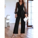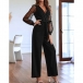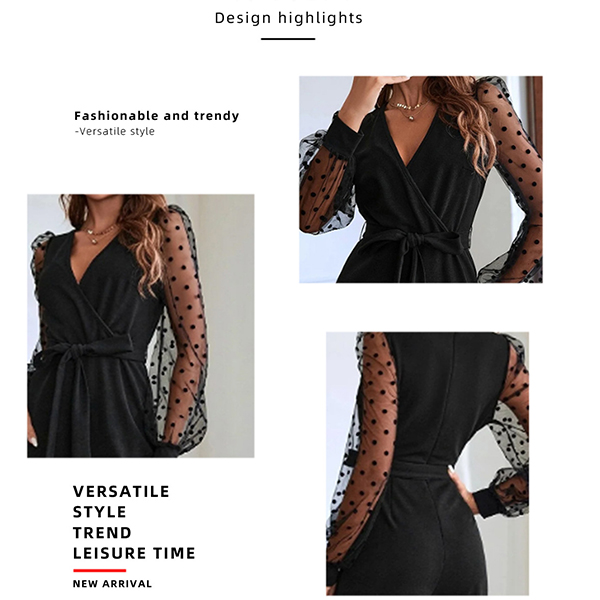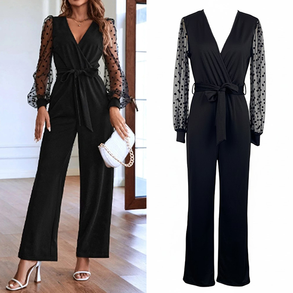 Denna charmiga jumpsuit har en smickrande V-ringning och fina, gasbindade skarvar på långärmen som ger en modern, feminin elegans. Det prickiga mönstret längs ärmen tillför en fantasifull charm och tidlös, vintageinspirerad elegans. Vill du prova?
