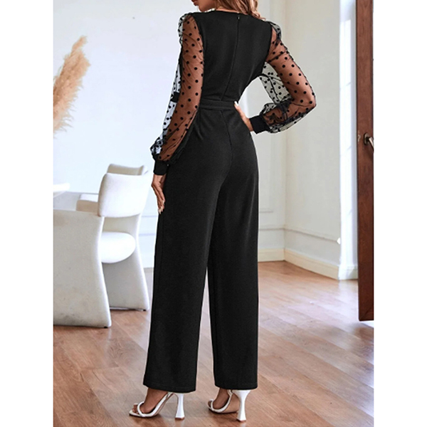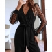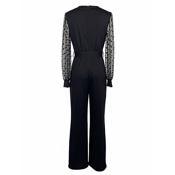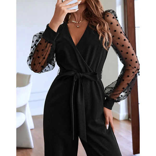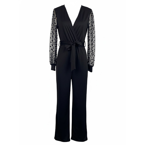 Jumpsuit V-ringad med prickigt tryck i gasväv, långärmad med knytband i midjan