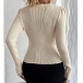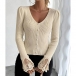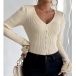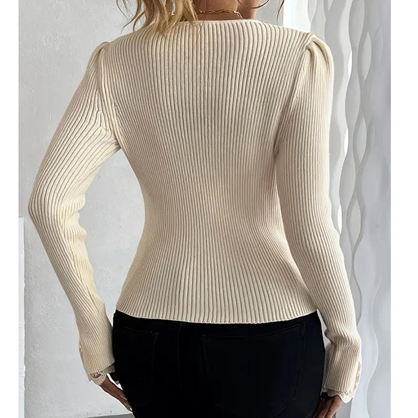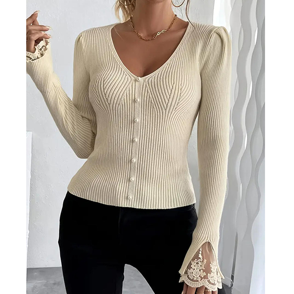 Trendig ribbad långärmad skjorta med V-ringning och pärlspetsdetaljer