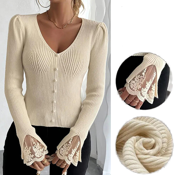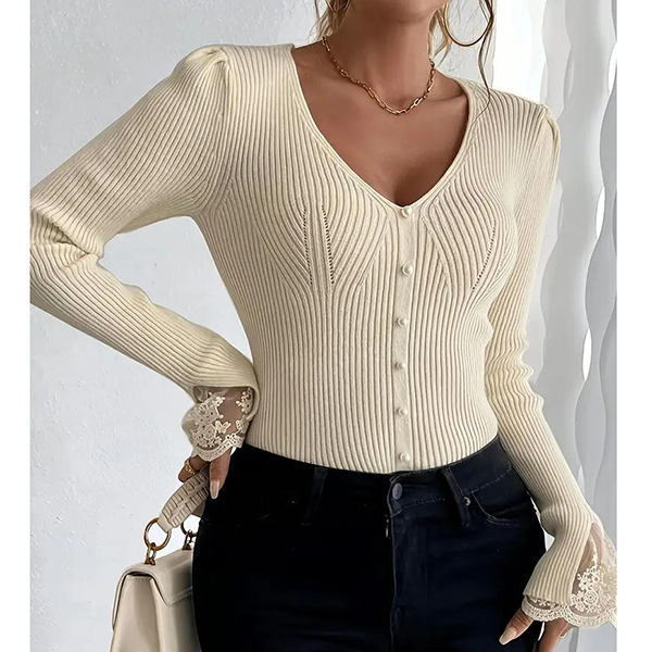 This sophisticated shirt features elegant V-neck styling with delicate bead embellishments and romantic lace splicing along the cuff for contemporary feminine elegance. Pair with tailored trousers and blazers for professional sophistication.