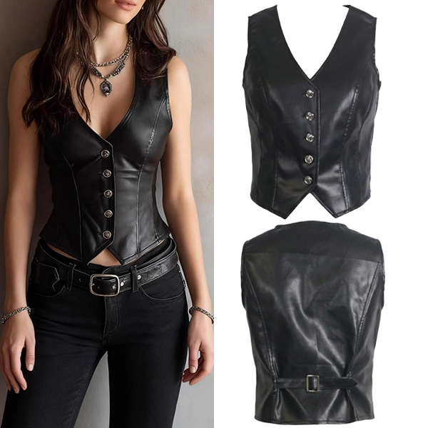 Trendigt ärmlöst PU-linne i konstläder med V-ringad knäppning fram