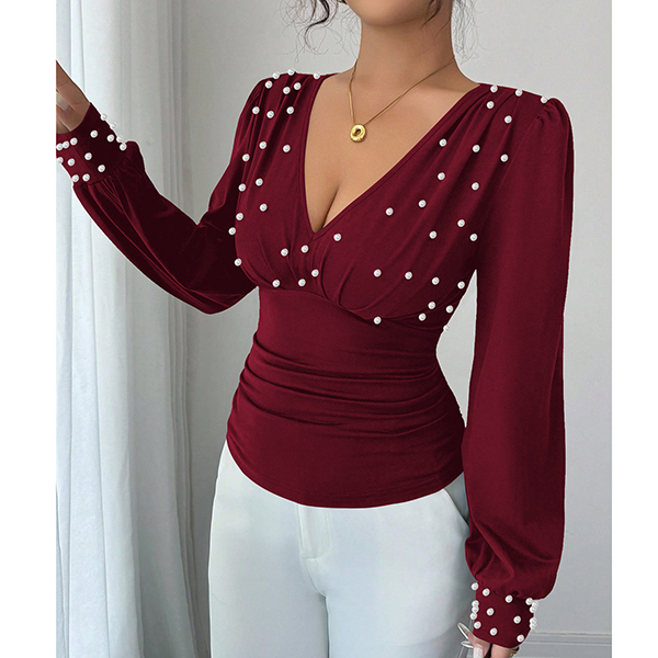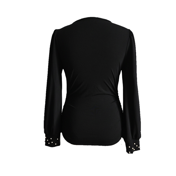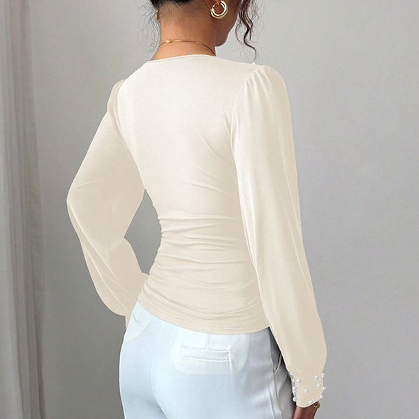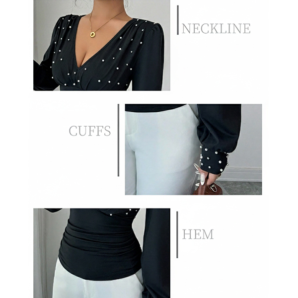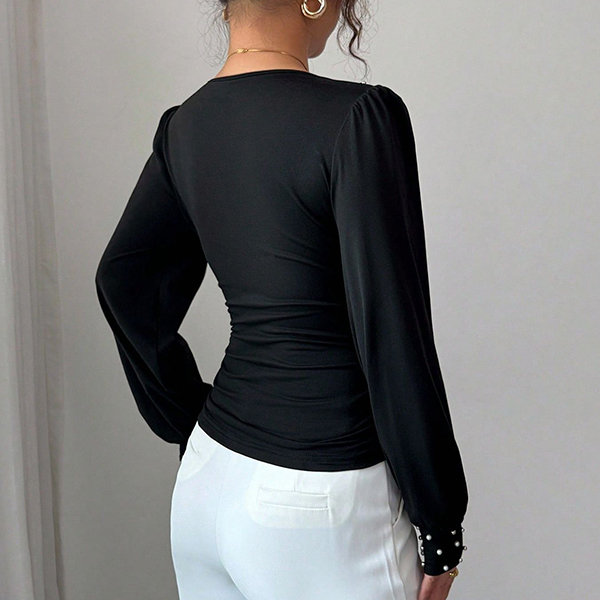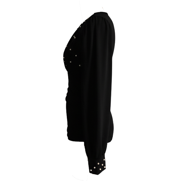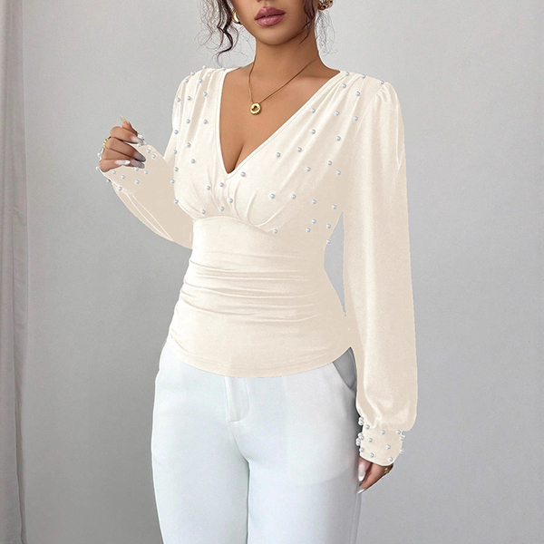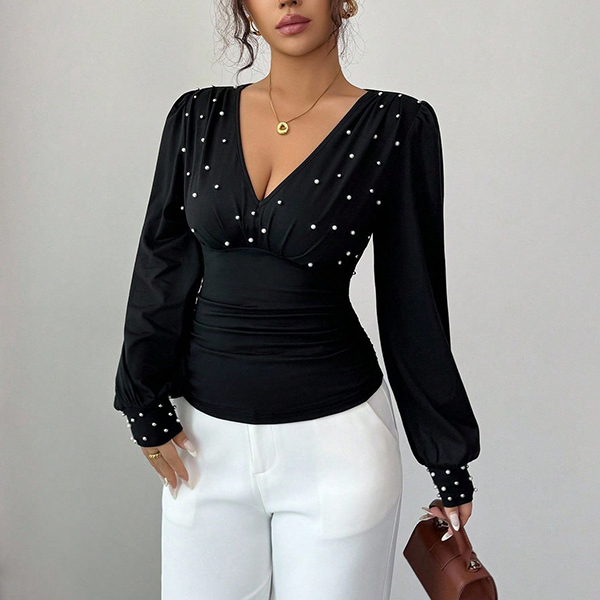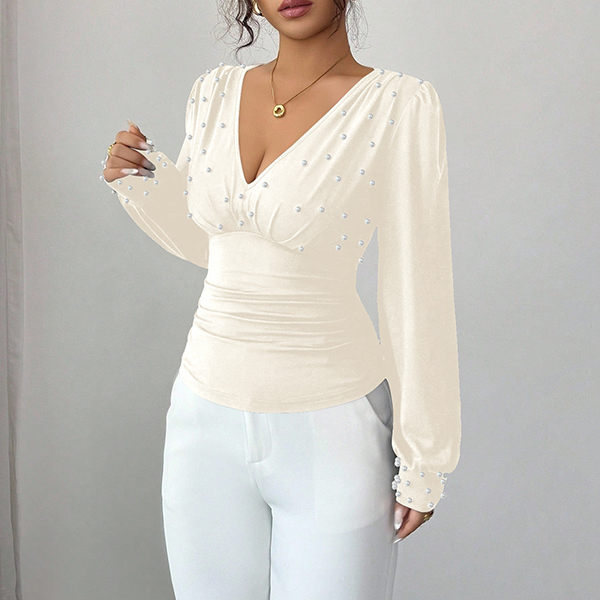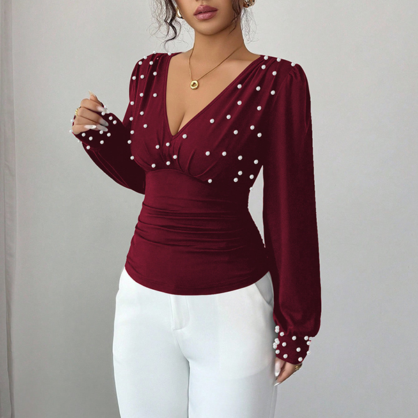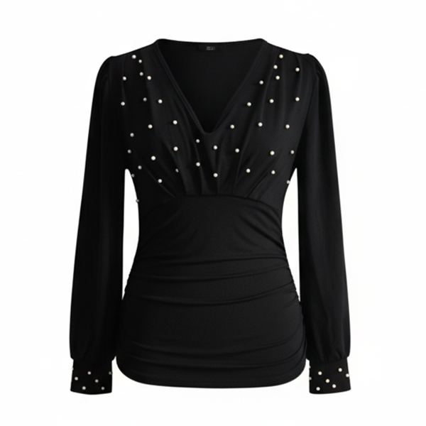 Upplev nordisk elegans med vår V-ringade skjorta i svensk design. Handsydda pärlutsmyckningar längs den djupa V-ringningen ger en unik och exklusiv känsla som skiljer den från massproducerade plagg. De långärmade, lätt puffade ärmarna skapar en modern silhuett, medan det mjuka, premiumvävda tyget garanterar komfort och hållbar vardagslyx. Perfekt för kontorsmiddagar, after work eller festliga tillfällen – kombinera med skräddarsydda byxor och högklackade skor för en sofistikerad helhetslook. Den tidlösa designen och detaljarbetet gör denna skjorta till ett måste i din garderob när du vill utstråla stil och självförtroende.