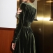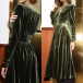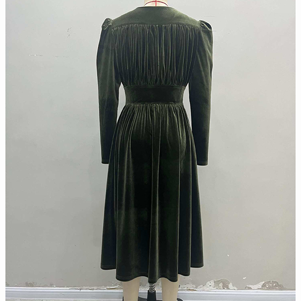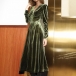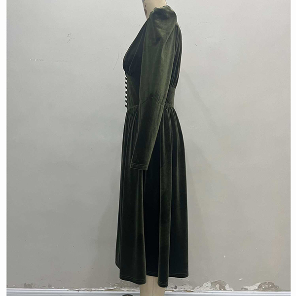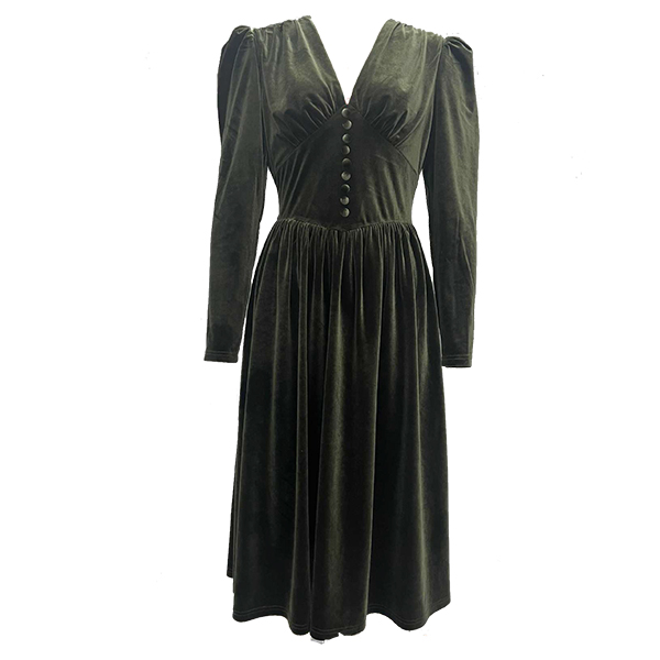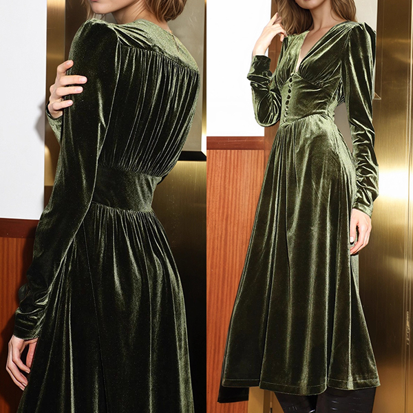 Denna gröna klänning har en smickrande V-ringning, klassiska knappdekorationer framtill och en hög midja som ger modern, lyxig elegans. Sammetstyget erbjuder taktil rikedom och sofistikerad elegans. Vill du prova?