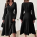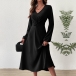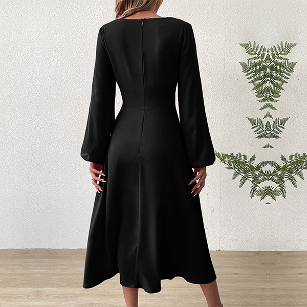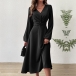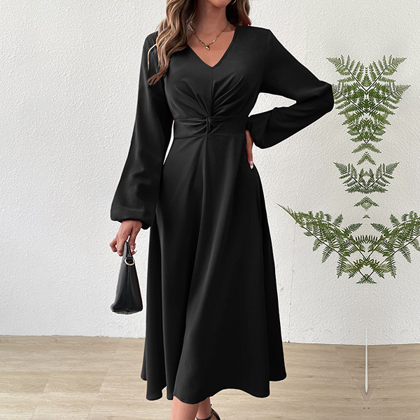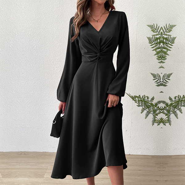 This black dress features elegant V-neck styling with flattering ruched high-rise waistline and midi-length. Perfect for daily wear.