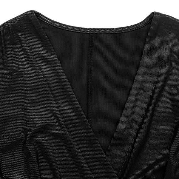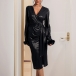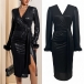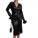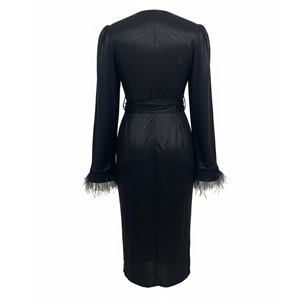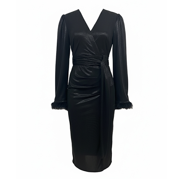 Upplev ren lyx i denna svarta festklänning med djup V-ringning och långa ärmar prydda med plyschkantade muddar. Den iögonfallande slitsen framtill ger en modern, självsäker attityd samtidigt som det justerbara midjebältet formar och framhäver din siluett. Enastående kombination av exklusiv design och komfort – styla med ankelboots och noga utvalda accessoarer för en oförglömlig look.
