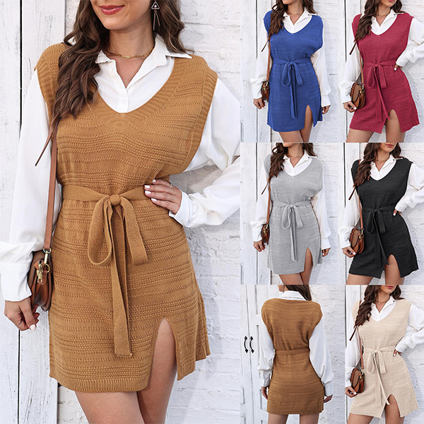 Denna trendiga och chica stickade västklänning har en smickrande V-ringning, ärmlös design, sidoslitsar och en självknytande detalj som ger en touch av sofistikering och stil till din outfit. Kombinera med blus för en modellook.