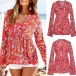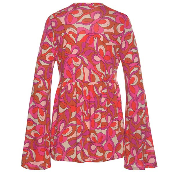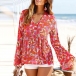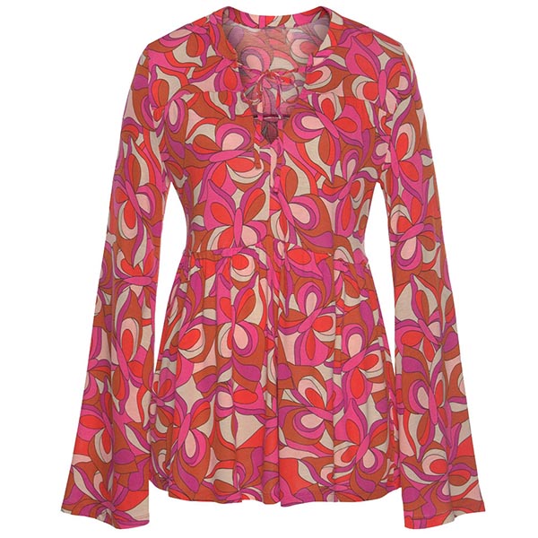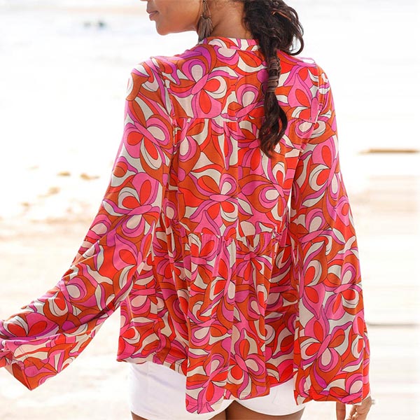 Your wardrobe can look more colorful when you add this printed top to it. The v-neck and trumpet sleeve design can easily enhance its charm,while its soft fabric and loose silhouette can ensure you a comfortable day. Matching with your tight pants would be a good idea.