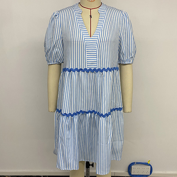 Den här klänningen har vertikala ränder, en smickrande V-ringning, korta ärmar och en lager-på-lager-siluett, vilket skapar en modemedveten och iögonfallande look.