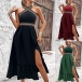 Den här klänningen har en halterneck, ärmlös design, vågmönster och en sidoslitsdetalj som ger en touch av elegans och sofistikering till din look. Perfekt för varma dagar eller speciella tillfällen.