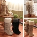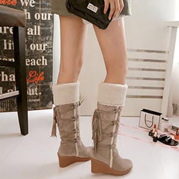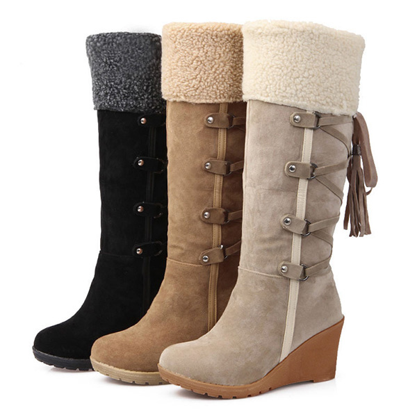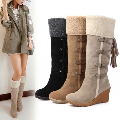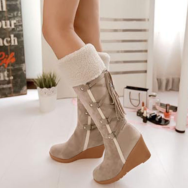 När dagarna blir kalla är det här paret stövlar värt att väcka din uppmärksamhet. Den är utrustad med kilklack, rund tå och plyschfoder, det här paret stövlar kan ge dig en varm och bekväm bärkänsla. All-match design gör det möjligt att matcha kläder i olika stilar.