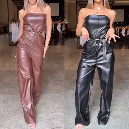 Byxdress i konstläder med tubtopp, midjebälte och raka ben