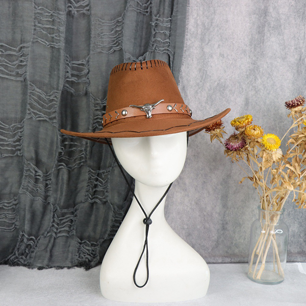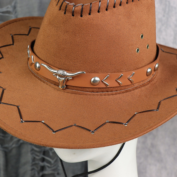 Cowboyhatt i fuskmocka: Blickfånget i looken. Har en varm brun ton med sydda brättdetaljer och ett robust hattband.