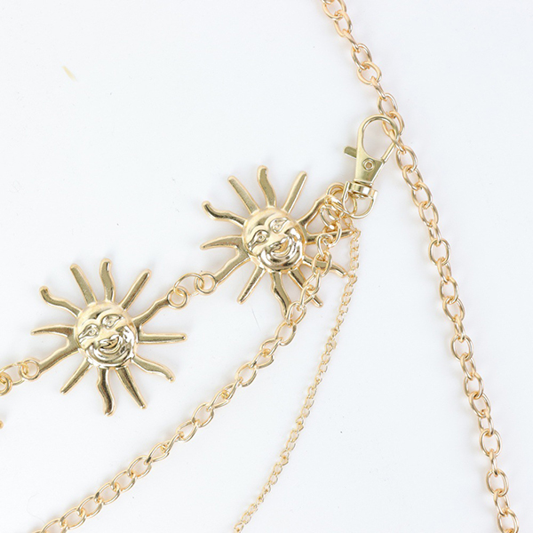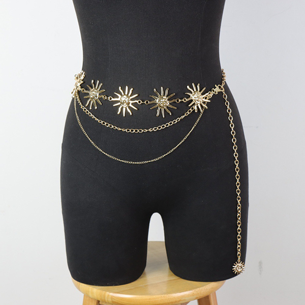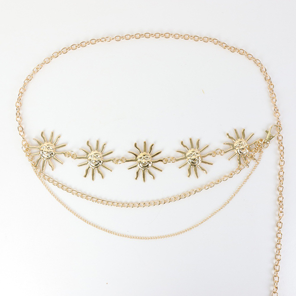 Himmelskt solkedjebälte: Höj midjan med detta bländande kedjebälte i guldfärg med solformade berlocker. Det hänger perfekt över shorts eller kjolar.