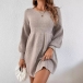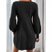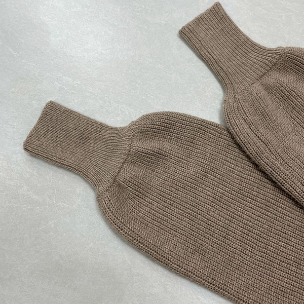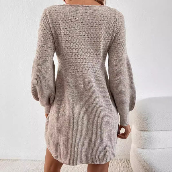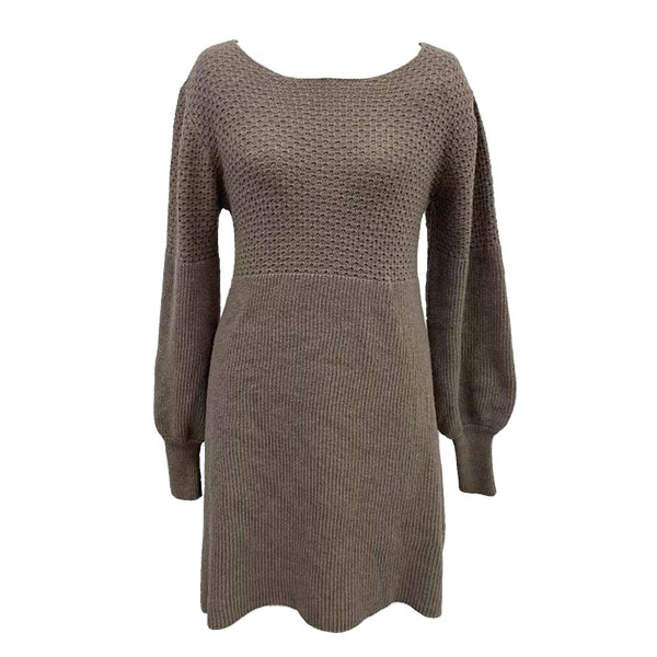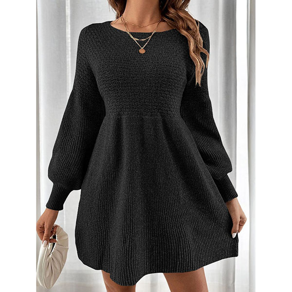 Stickad A-linjeformad klänning med hög midja, rund halsringning och puffärmar