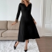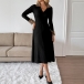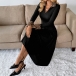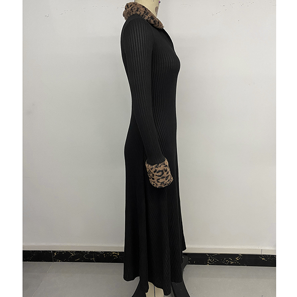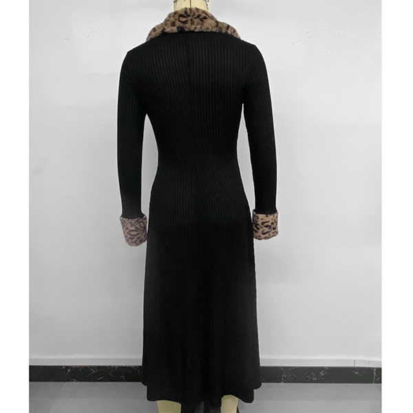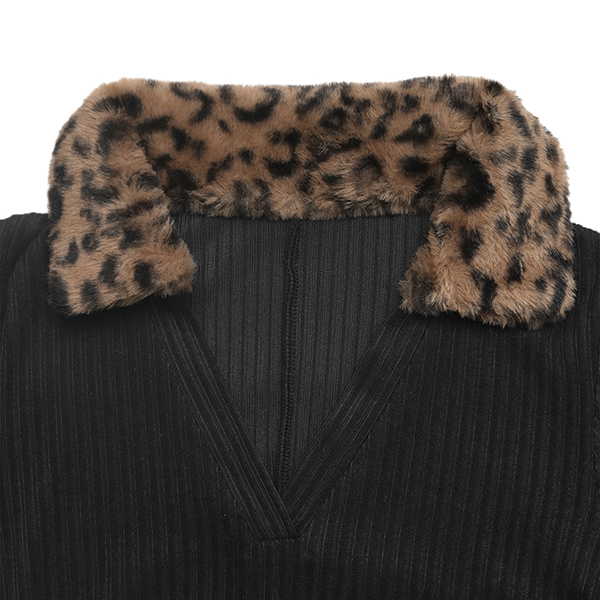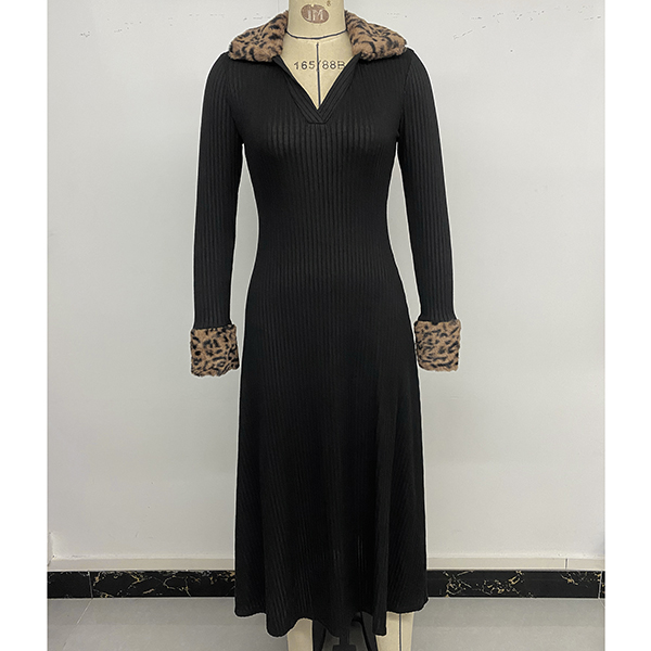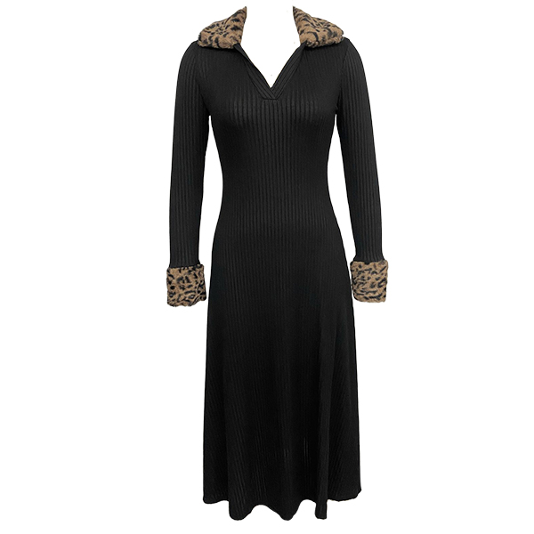 Moderiktig ribbad svart klänning med leopardtryckt krage och manschett