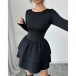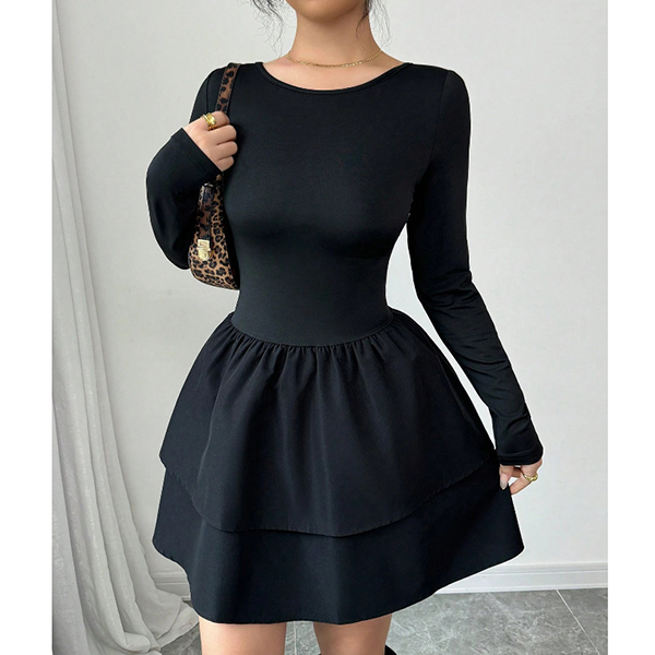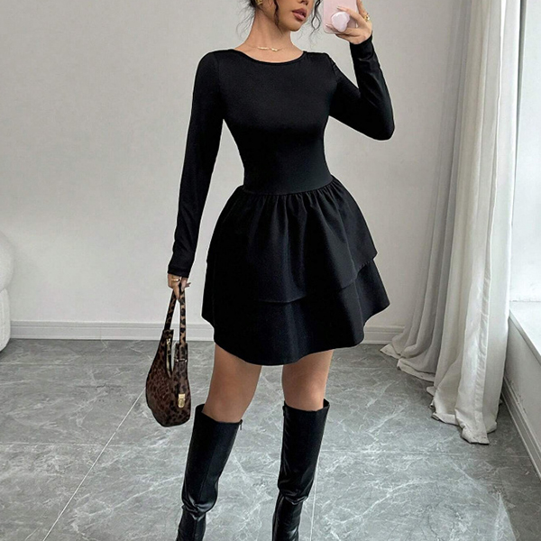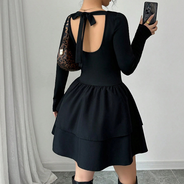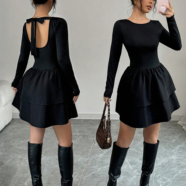 Moderiktig rund halsringning med långa ärmar och skiktad rygglös miniklänning