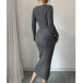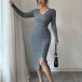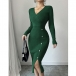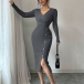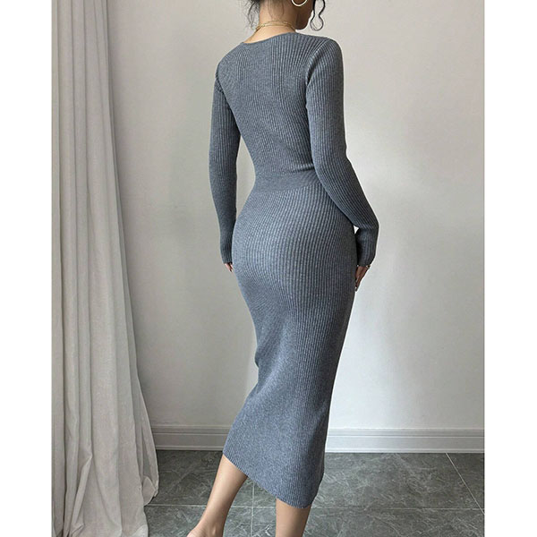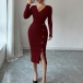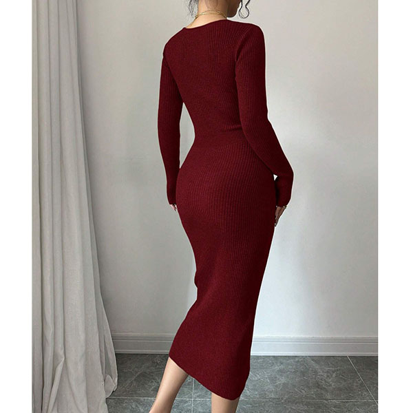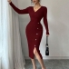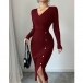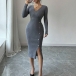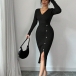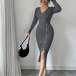 Moderiktig V-ringad långärmad sidoknäppning i sidoslits med bodycon-mönster och ribbad klänning