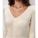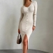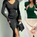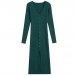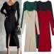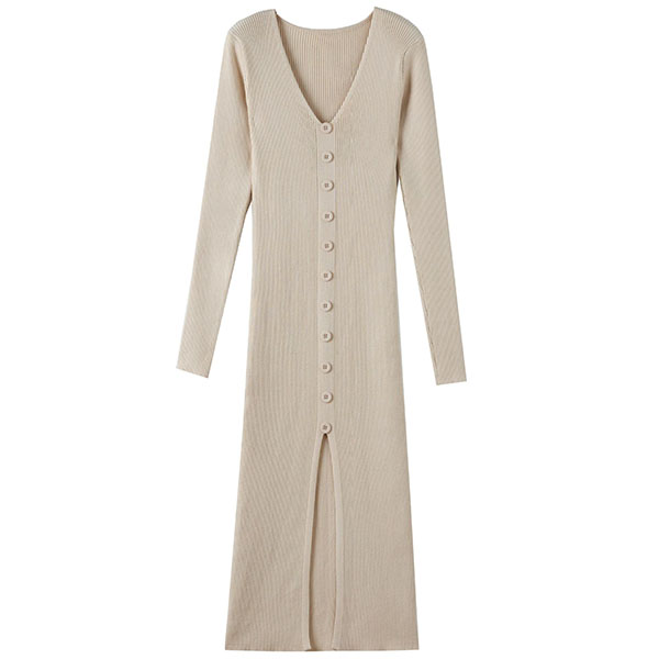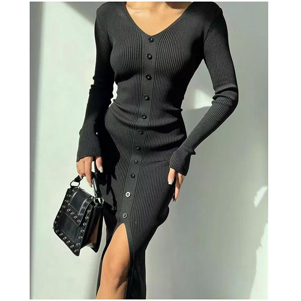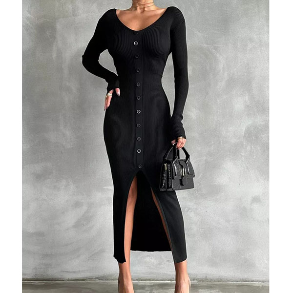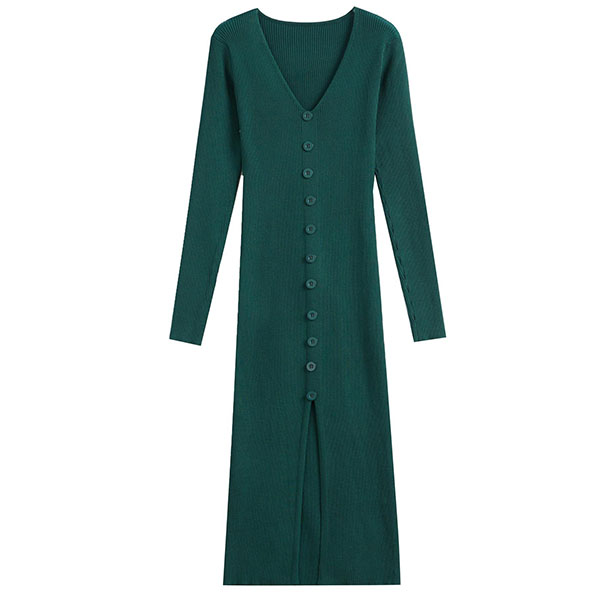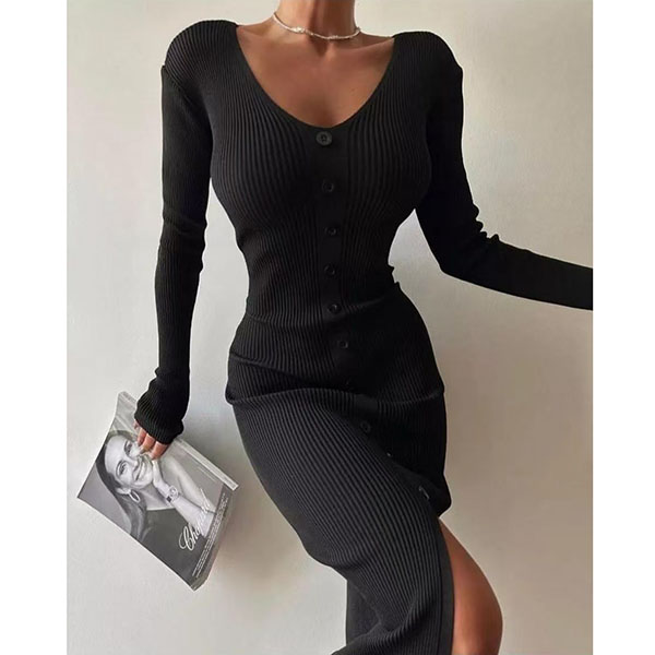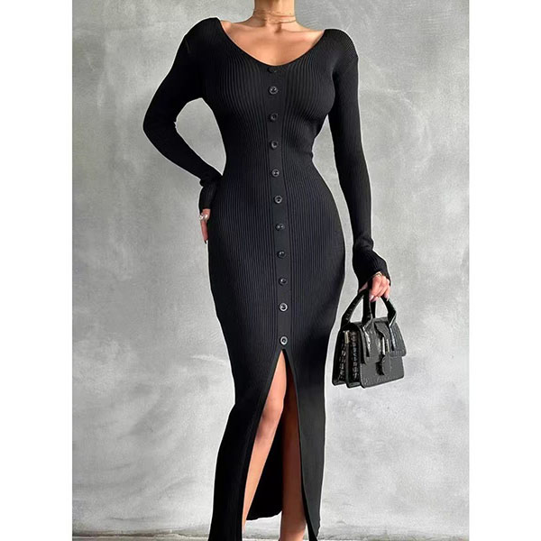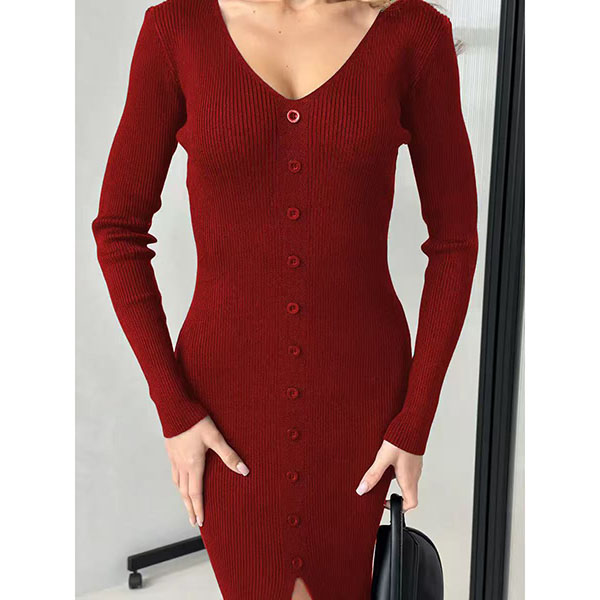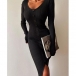 Moderiktig enfärgad långärmad V-ringad framknäppt ribbad bodycon-klänning