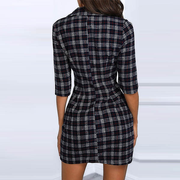 OL Style Half Sleeve Notched Lapel Double-breasted Plaid Dress