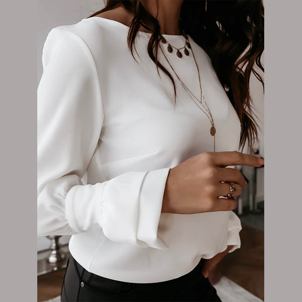If you wanna a stylish,delicate and elegant working look,then you can have a try this blouse. It features a classic yet stylish white tone,finished with trumpet sleeve and round neck design,stylish yet feminine. You can simply match with your favourite bottom to finish a charming dress up.