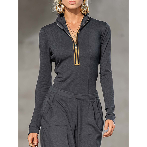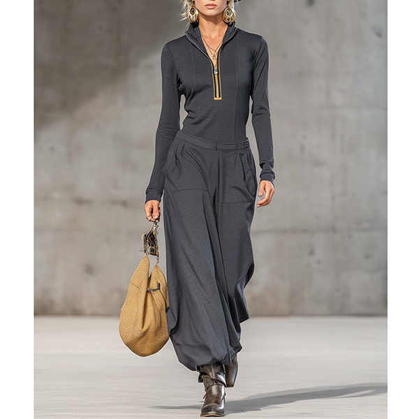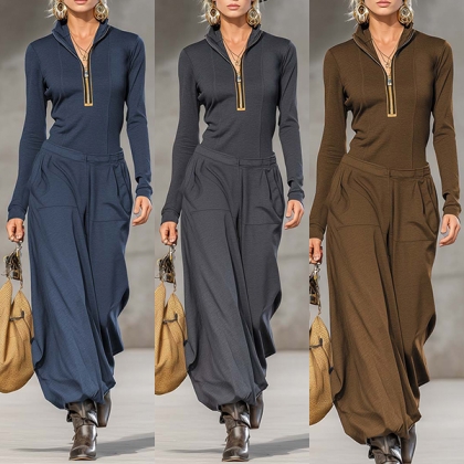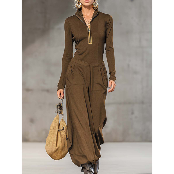 Moderiktigt tvådelat set bestående av skjorta med dragkedja och ståkrage och lösa byxor