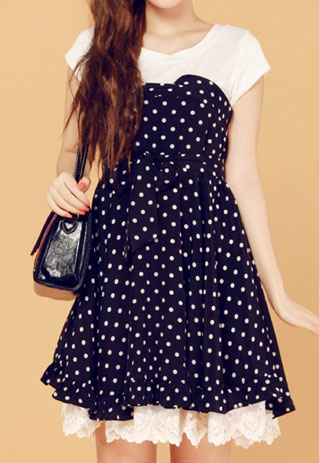 The dress is designed to sit high at the waist and features a simple round neck,short sleeves,polka dots print,a bow belt and a beaded zipper slider,which add to its girlish appeal.Team it with a bowknot embellishment sandal.