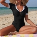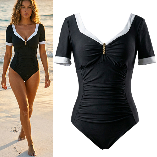 Monokini i retrostil med kontrastfärgade detaljer och ärmar – elegant V-ringad baddräkt med rynkad midja för magkontroll