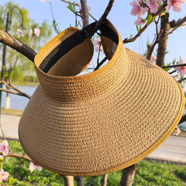 Solhatt - vikbar stråhatt med brett brätte och öppen krona för hästsvansar och knutar
