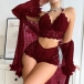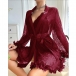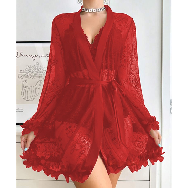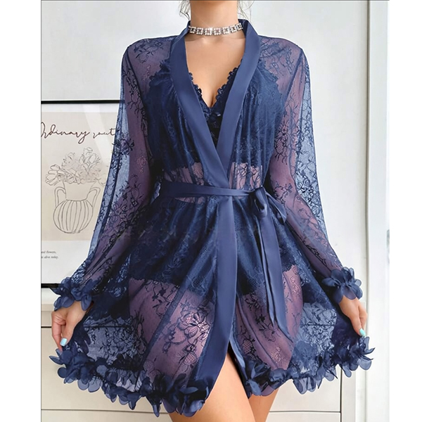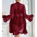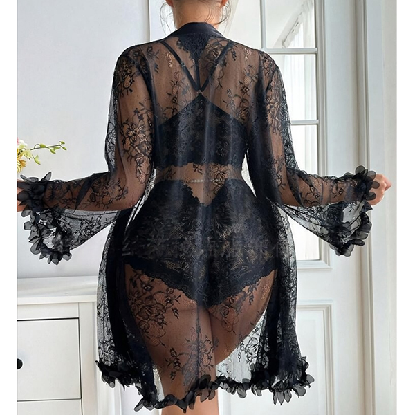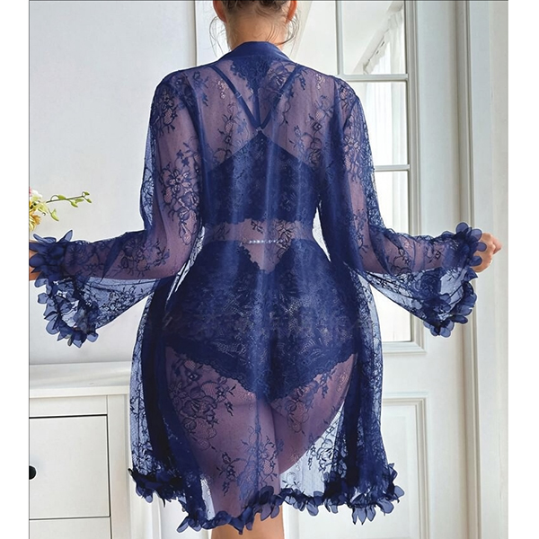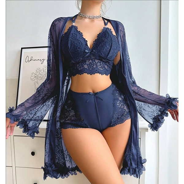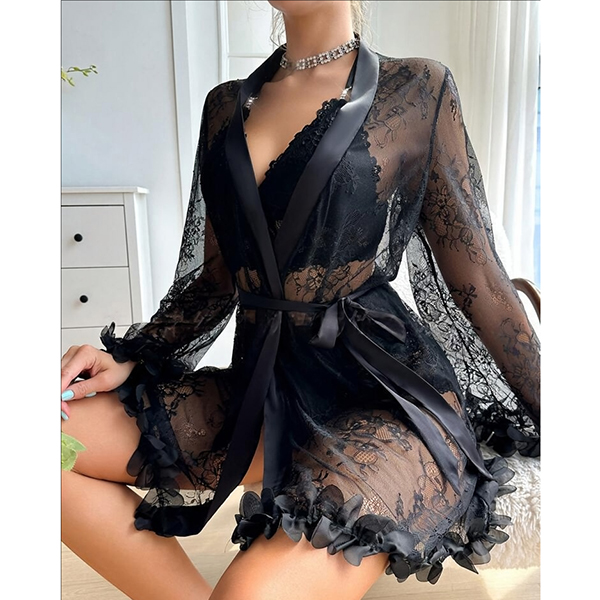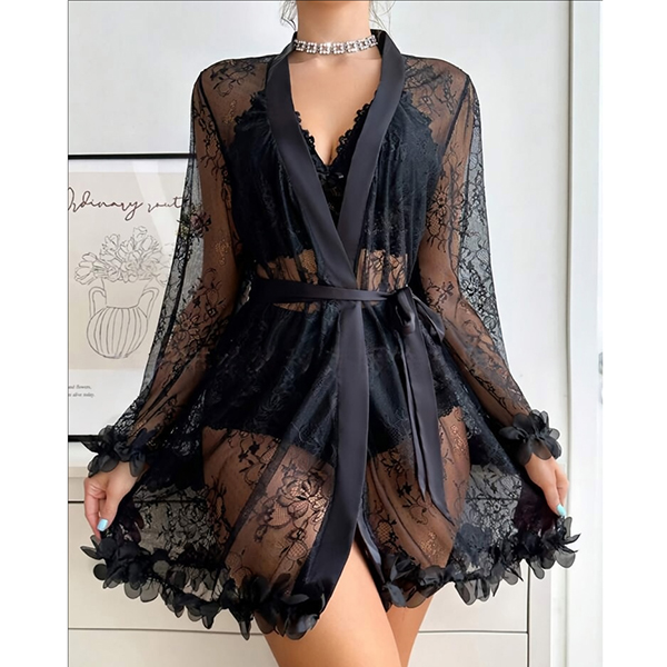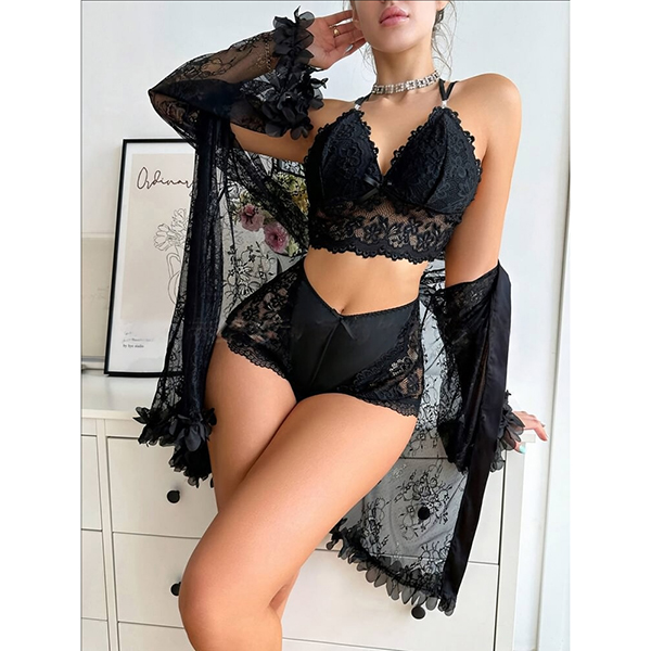 Moderiktigt spetsset i tre delar bestående av halvgenomgående morgonrock, rygglös BH och shorts med medelhög midja