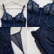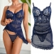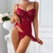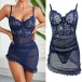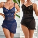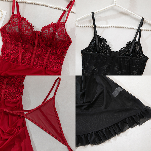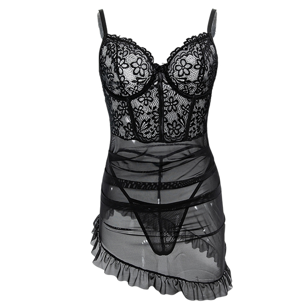 Sexigt nattlinne i genomskinligt mesh och spets med strumpebandshållare och T-backtrosa