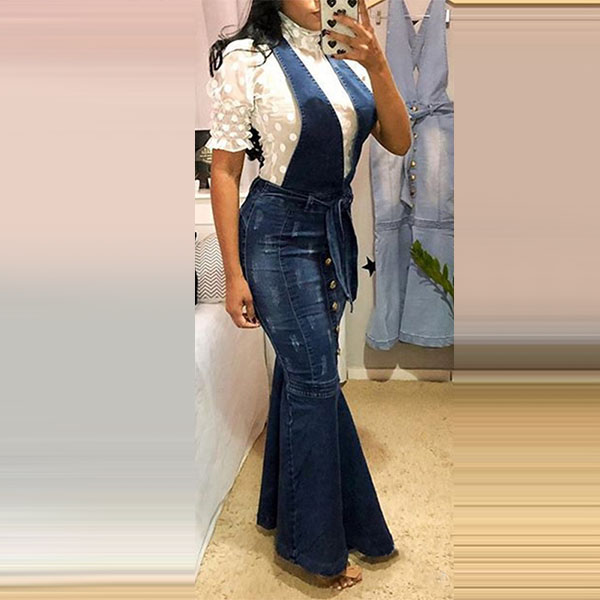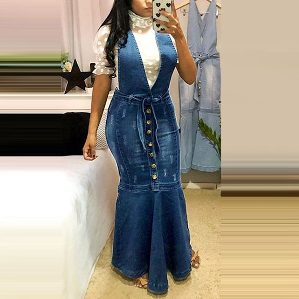 When you wanna update your style and boost your charm,you can just make your eyes focused on this denim suspender skirt. Its sexy and alluring design details like deep v-neck,high waist and fishtail hem design can easily make your stand out. Try to match with your favourite top to finish a charming look.