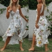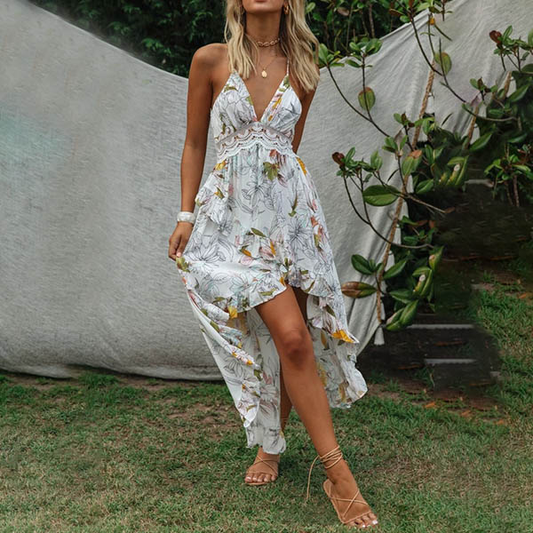 Sexy Backless Deep V-neck Irregular Hem Lace Spliced Printed Dress