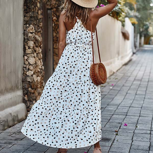 For a beautiful and charming trip look,you can just trust in this dress. Sling style and backless design can offer you a sexy and flirty look,while the dots printed details will make this piece look more eye-catching and playful. Greet the summer days with this delightful dress.