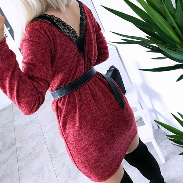 Combines of cozy and feminine vibes,this dress won't let you disappointed! The backless,v-neck and lace spliced details make it look sexy and flirty,while the fit silhouette design will demonstrate your slender figure. In these spring or autumn days,you can slip into thus dress to express your beauty.