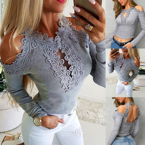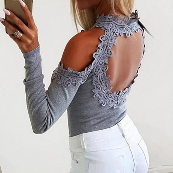 Sexy Backless Off-shoulder Long Sleeve Round Neck Lace Spliced Top