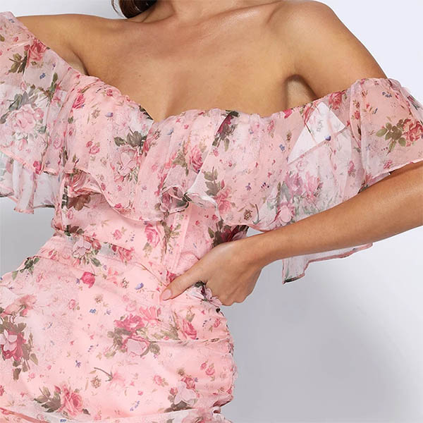 You can look stunning and beautiful enough in this dreamy dress! Features vibrant floral print details,the backless,off-shoulder and ruffle design will make you look more alluring. When adding a sparkle necklace,you would be more charming!