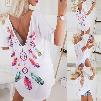 Sexy Backless Short Sleeve Round Neck Printed Top