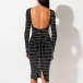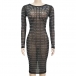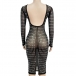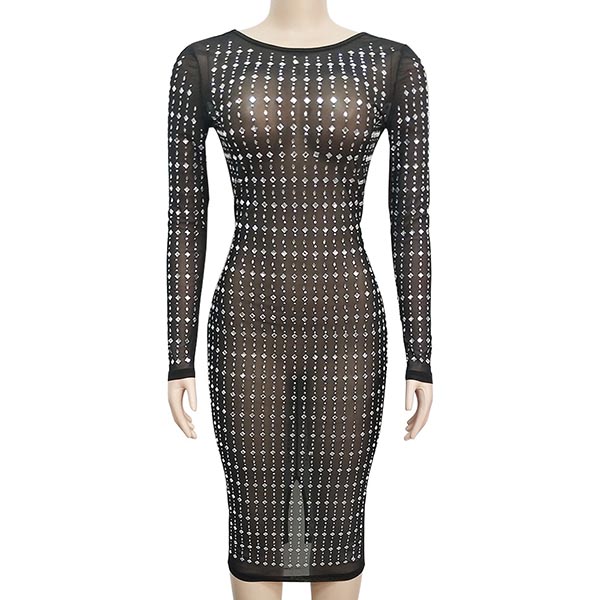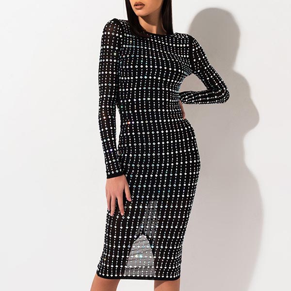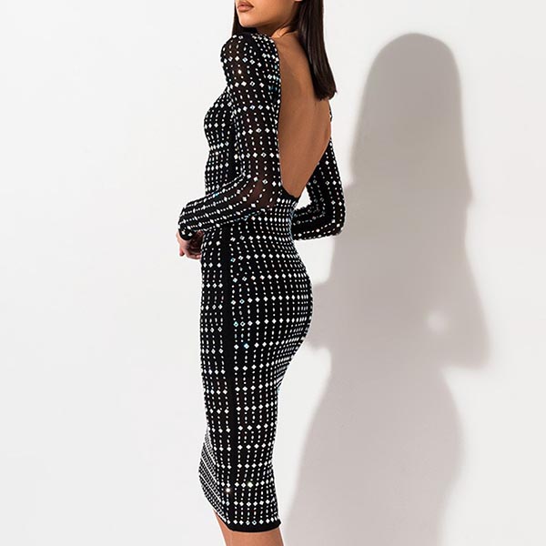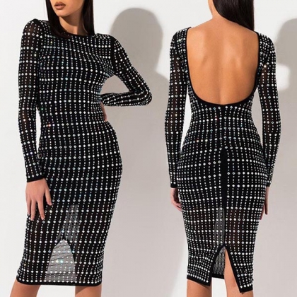 Sexy Backless Slit Hem Long Sleeve Slim Fit Rhinestone Dress