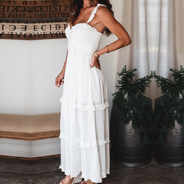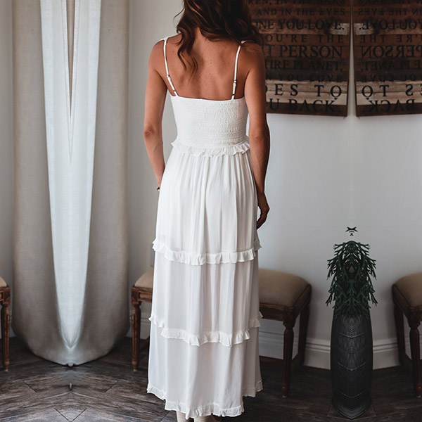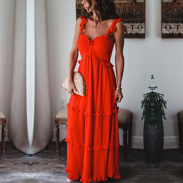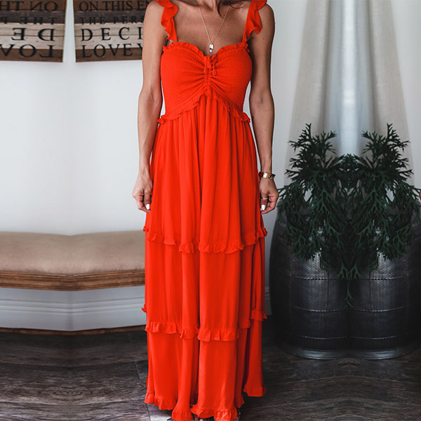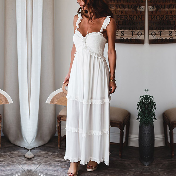 When walking on the beach with this maxi dress,you can easily be a pleasant sight to draw more attention. Sling style,with backless,Square Collar and ruffle details,this piece knows how to exude your sexy,flirty and feminine side. On these sunny days,adding a sweet straw hat would be more perfect. So why not add this piece to your summer wardrobe ensemble?